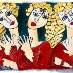 Avi Ben Simhon uses his signature inverse collage technique in the creation of ‘Three sisters’, before painting on top with bright oil paints. The three women are depicted in matching red dresses, all similar looking with long necks tilting their heads in different directions. Their expressions are neutral, with each holding up a waving hand. Inspired by cubism and fauvism, Avi painted many colorful and unique looking women with robust hair, long necks and beautiful clothing in different still life scenarios. Each serve to communicate layers of emotion, open to interpretation by the viewer in differing ways. His different intriguing depictions of various women, set a mood through their raw stances and expressions. Contact us regarding the price and availability of this piece. We ship worldwide.