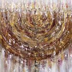 Gitty Fuchs’ original piece ’Abstract Menorah’ depicts the Judaica menorah candelabra. Inspired by abstract expressionism and fauvism, Fuchs created the piece to be seen as a menorah, while simultaneously upon looking further, it can be seen as an abstract illustration of Kriyat Yam Suf. The artist uses gold leaf and 6 layers of paint to create her recognizable, richly textured and layered work.