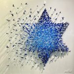 ‘Flying Star of David’ showcases the timeless Star of David, being made up of countless small birds flocking in motion. The work is composed of laser-cut metal pieces on lacquered wood board, giving it variation and a dynamic that draws the observer’s eye across the artwork.This series draws its inspiration from nature as well as from the computerized world and the doors it opens for artistic creation. Joel finds the ironic process of forming steel, a heavy and cold material, into such delicate forms of life such as the birds in ‘Flying star of David’ to be an essential dimension to his work, provoking not just breathtaking imagery but layers of added meaning.