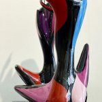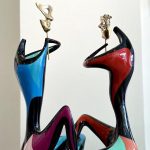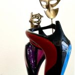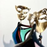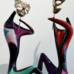 ‘Game of Masks’ depicts two colorful figures sitting across from each other touching, playing, whilst holding up ornate golden masks. The masks symbolize the two withholding some truths from one another, yet at the same time, they are curious and close. Gadi reflects the idea that life is like a game, and through play, the line between closeness and pretense is blurred. The two figures are intimately close, reflected by their corresponding radiant colors, separated only by a thin veil, a mask of performance.
