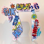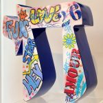 Kapiano uses resin to construct Chai (life). A sculpture designed in a bright graffiti style in the Hebrew letters spelling Chai. The word Chai carries strong significance in Jewish culture, symbolizing resilience, continuity and vitality for life, also in Hebrew numerology, Chai is equal to 18 being a lucky number in Jewish tradition. The sculpture is filled with pop art style slogans and playful icons, hand and spray painted in English and Hebrew. The result is a bold, bright and proud visual statement filling a space with energy. Customization is available to make this piece your preferred color upon consultation. Contact us for more information.