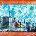 Dan Groover illustrates the surrounding walls of the old city, in a unique pop art style in ‘Jerusalem Forever’. Contrasting bright colors of orange, blue, white and green splatters of paint bring dimension to the piece, celebrating the ancient holy city. The unique piece is made using mixed media and acrylic paint on Metal mounted wood base painted.