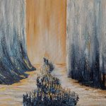 In her original artwork, ‘Kriyat Yamsuf’, Gitty Fuchs depicts the Jews crossing the Red Sea, upon leaving Egypt as slaves into freedom as a nation. The classic biblical story relates the birth of the Jewish nation and is extremely significant in Judaism. Remembering and retelling the event itself is an integral part of Jewish faith, religion and heritage. The artist illustrates this wonderfully using 6 layers of acrylic and oil paint to build beautiful texture, finishing the magnificent, original work with gold leaf.