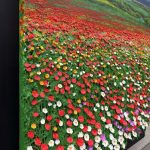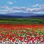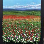 ‘Field of Poppies’ is an original landscape oil painting, depicting a sweeping field of red poppy flowers, to the background of peaceful mountains and meadows in the distance. Vila uses oil paint and unique technique to preserve natural flowers on board. The contrasting flowers and textured branches fill the foreground of the painting with a bursting array of colors and shapes. The observer’s eye can get lost in the sweeping field, being drawn back and forth between the vibrant colors and textures layering this mesmerizing masterpiece.