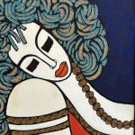‘Let Me Be’ is a portrait impression of a unique, beautiful woman. The subjects’ eyes are closed, her eyelashes and lips magnified in size and color, while her hair is a wild mane of vibrant blue curls. She is dressed in recognizable Roma style, and her head rests peacefully on her shoulder. Inspired by cubism and fauvism, Avi Ben Simhon communicates layers of emotion in his depiction of various women, setting a mood through their raw stances and expression. Contact us regarding price and availability, we ship worldwide.