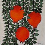 ‘Pomegranates in Threes’ is a vibrant artwork featuring three pomegranates hanging off an evergreen vine, ripe for the picking. The fruit holds strong cultural significance and is a staple in modern, Israeli culture. Strong oranges and greens contrast each other against a stark background, creating this bright beautiful work using oil on canvas. Contact us regarding price and availability for this piece. We ship worldwide.