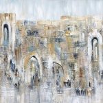 In her original work ‘Spirit of Jerusalem’ Gitty Fuchs depicts a landscape merging various sites within the holy Jerusalem into one, including the Jaffa gates, arches of the old city, holy of holies and the western wall. The result is a magnificent and unique illustration of the mystical beautiful Jerusalem. Through subtle color, layered texture and movement she highlights the landscape’s timeless beauty, oneness and depth. The artist uses oil and acrylic paint to build 6 layers of beautiful texture to create this layered work, finishing it off with gold leaf.