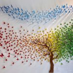 ‘Trees of Life’ is an intricate artwork depicting two trees’ leaves merging into swarms of colorful butterflies that form impressions of wind. Birds form a subtle wave above it. The layered work is composed of laser-cut metal pieces, hand painted and pinned on a lacquered wood board. The whole design is raised above the background by a few inches creating a cool 3D look.